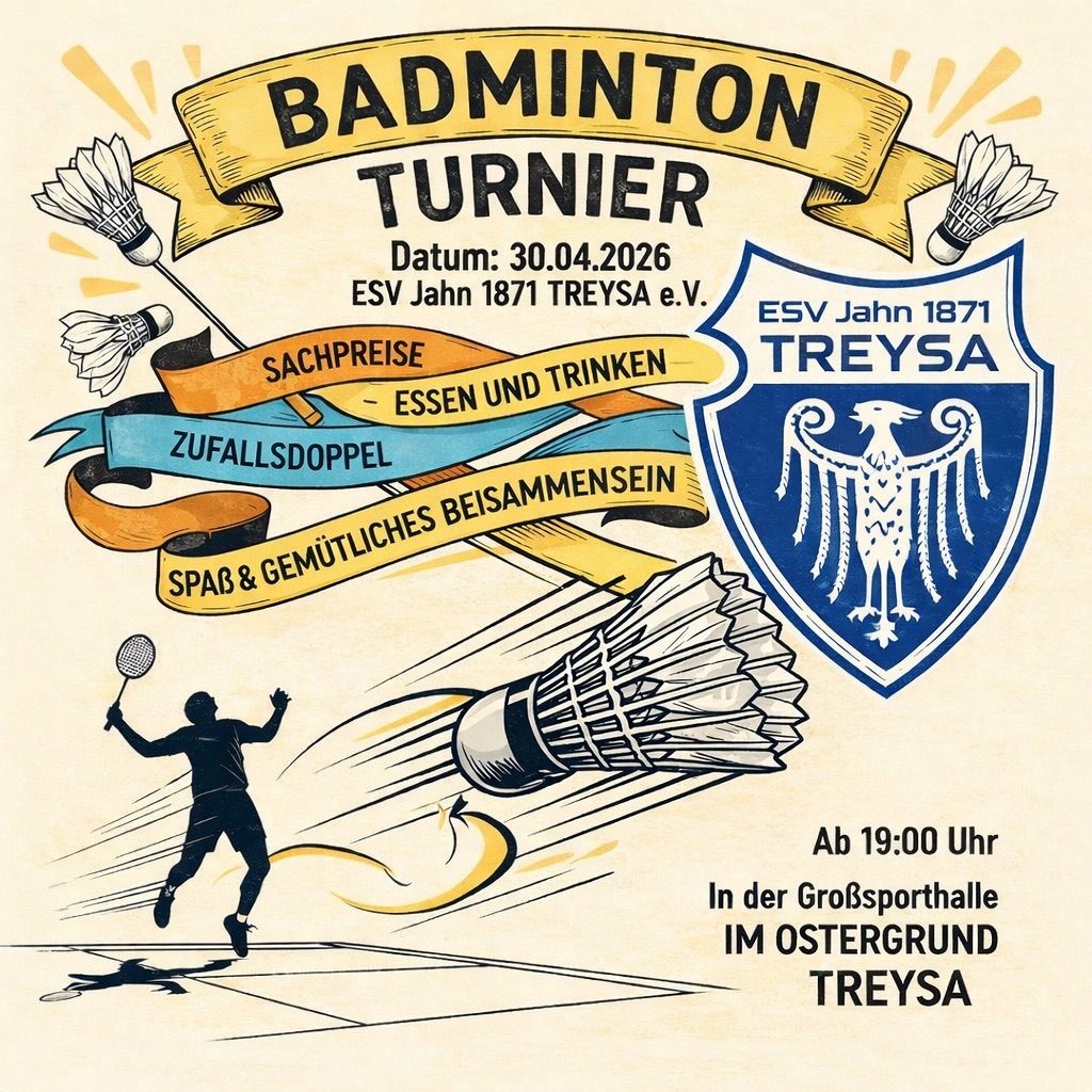 Am 03.04.2025 fand das Osterturnier der Badmintonabteilung des ESV Jahn Treysa statt. In lockerer Runde, diesmal mit Gästen aus Bad Hersfeld, wurden Zufallsdoppel bis 15 Punkte gespielt. Die schnellsten Gewinner bekamen Hasenohren zur Verlangsamung, und alle Satzgewinner bekamen Schokoladenostereier. Nach 9 Runden hatte Matthias Röschert die meisten Schokis gewonnen und wurde souveräner Sieger des Turniers. Zweiter wurde Henning Seilkopf, den Dritten Platz teilten sich Gunnar Krosky und Jinto Augustine.